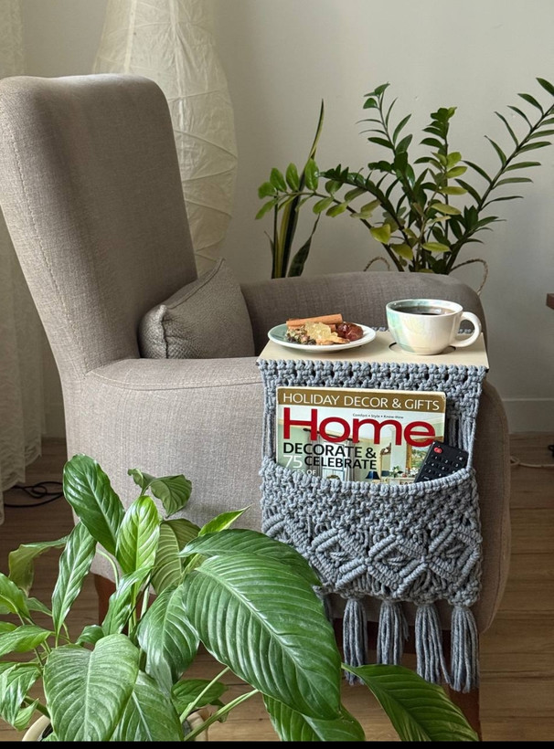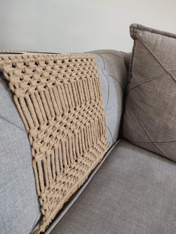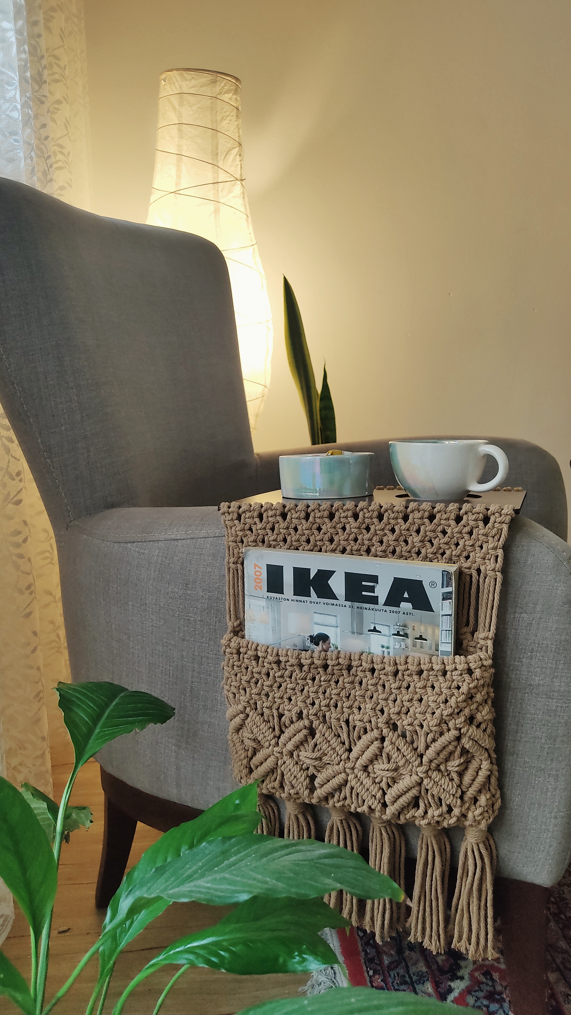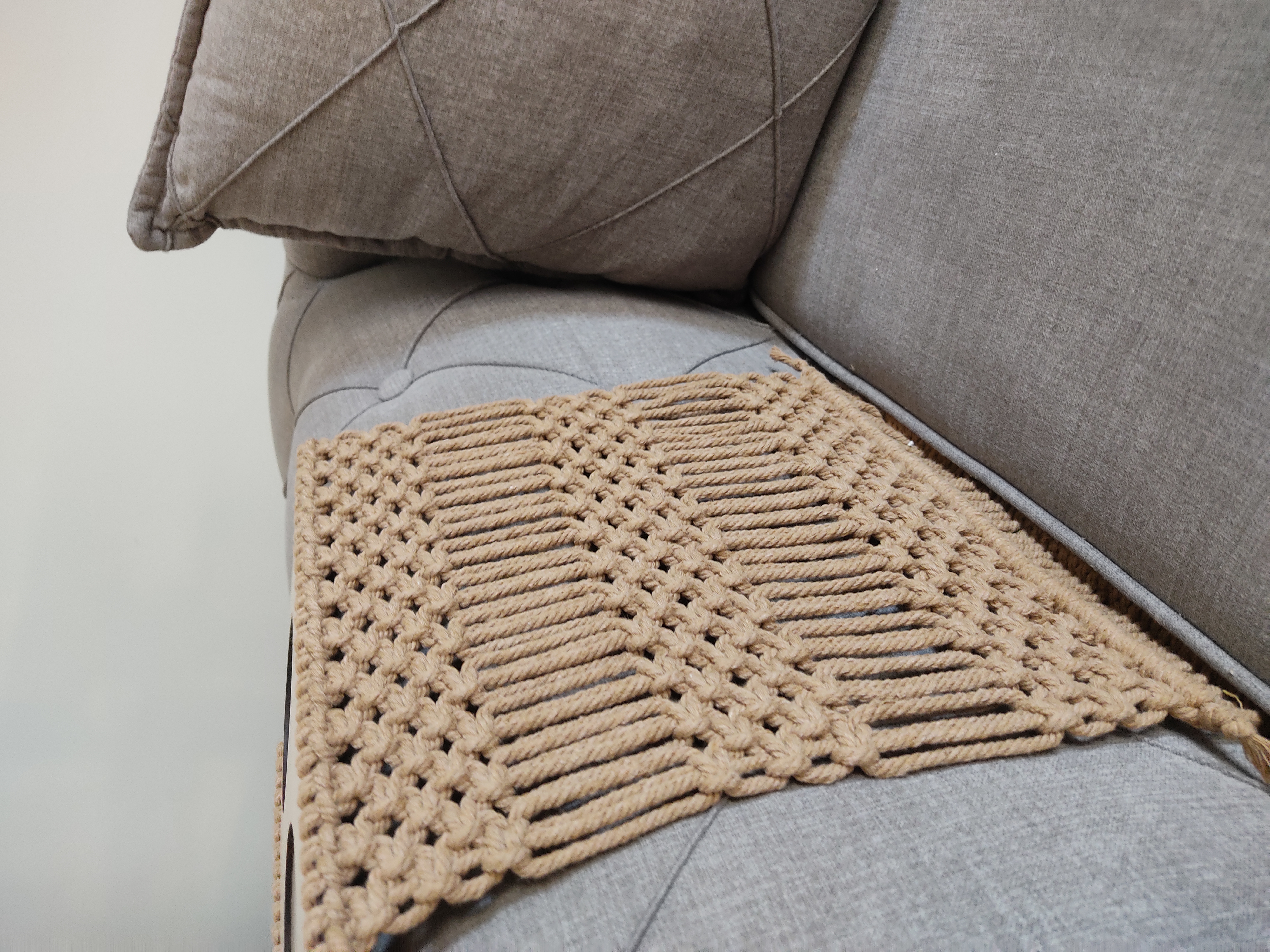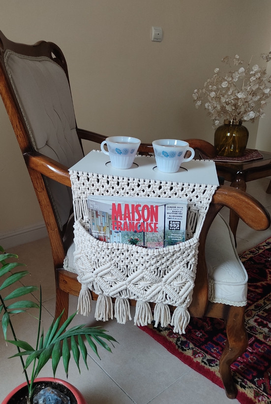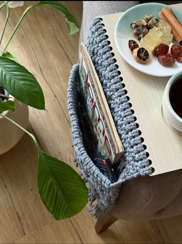 جا کنترلی مکرومه محصولی بسیار کاربردی که روی دسته مبل قرار میگیرد(برای مبل های دسته پهن) که شامل دو حفره برای جای فنجان و یک جیب برای قرارگیری کنترل ها و روزنامه و مجله میباشد .